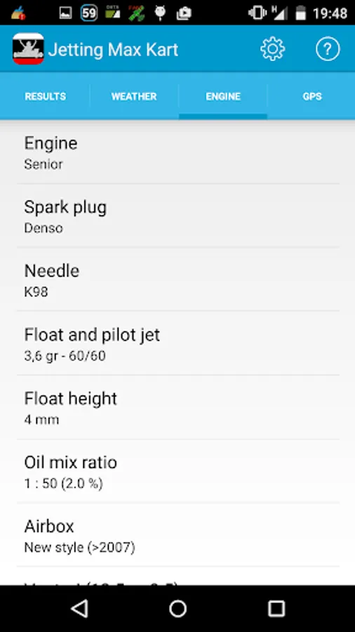 - Results: in this tab, the recommended main jet, needle position, air density and spark plug type values are shown. This data are calculated depending on the weather conditions and the engine configuration given in the next tabs. In addition, this tab lets to make a fine tuning adjustment to adapt to your concrete motor and carburetor.