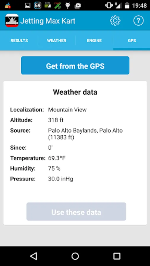 In order to get the weather values, the application can use the GPS to obtain the position and altitude, and the network connection to get the temperature, pressure and humidity from the nearest weather station. Nevertheless, the application can run without GPS and internet connection, in this case, the user has to enter the weather data.
