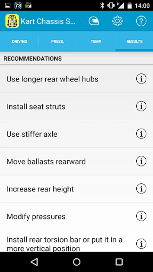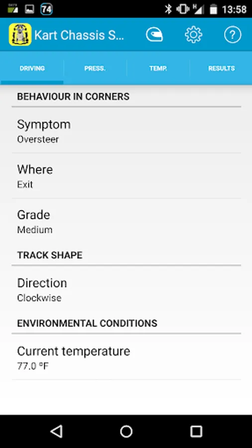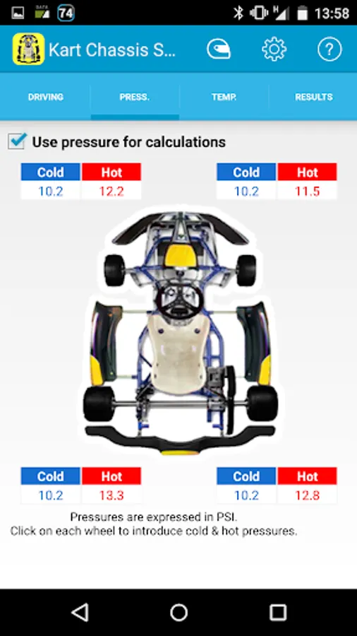 This app will help you set up your gokart chassis analyzing some information like tyre cold and hot pressures, tyre temperatures and behaviour in corners.