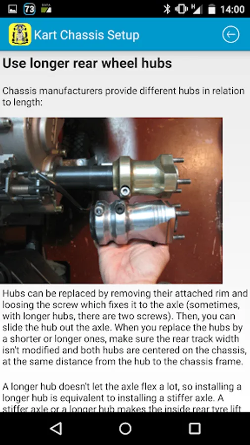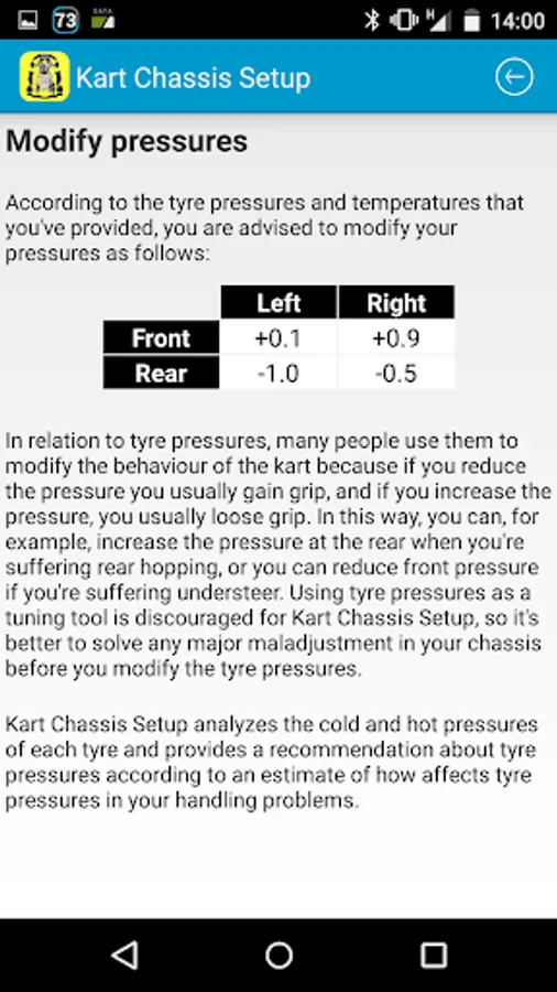 Using all the data that you provide the application will give you some advices about how to adjust your chassis in order to resolve any set up problem that you're suffering. For example: increase/reduce camber, width, axle hardness, etc. For each advice, you'll find an explanation about the adjustment. The explanation is usually accompanied by pictures to be more understandable.