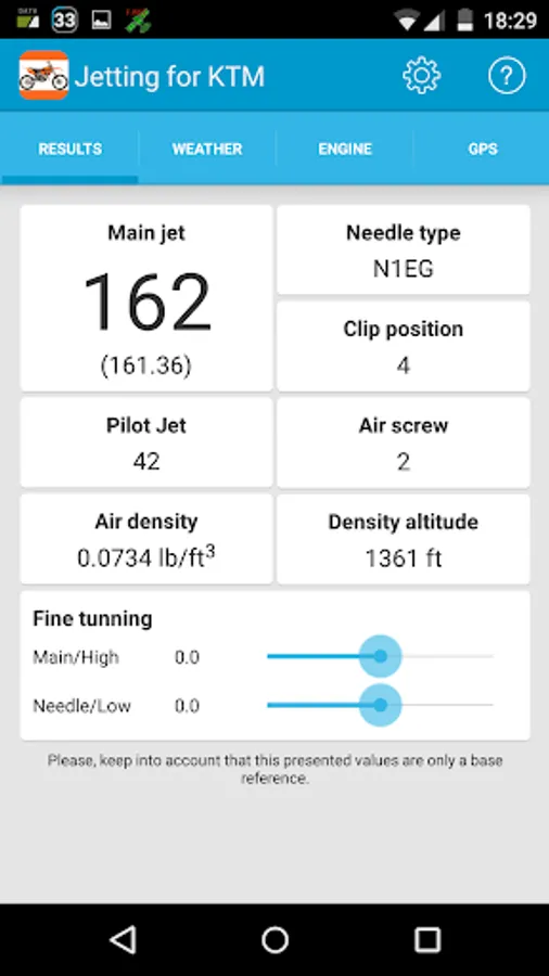 - Results: in this tab, the recommended main jet, needle type and clip position, pilot jet and air screw position are shown. These data are calculated depending on the weather conditions and the engine configuration introduced in the other tabs. In addition, this tab lets to make a fine tuning adjustment to adapt to a concrete engine and carburetor.