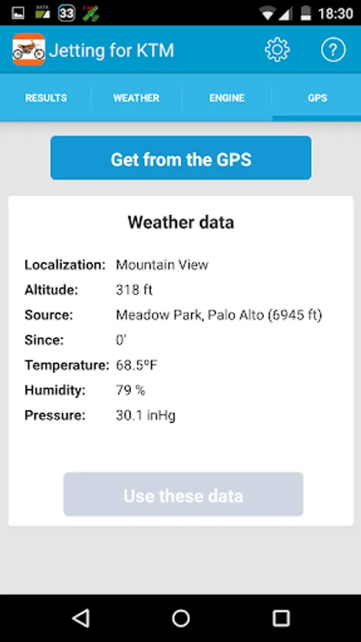 In order to get the weather values, the application can use the GPS to obtain the position and altitude, and the network connection to get the temperature, pressure and humidity from the nearest weather station. Nevertheless, the application can run without GPS and internet connection, in this case, the user must enter the altitude and weather data.