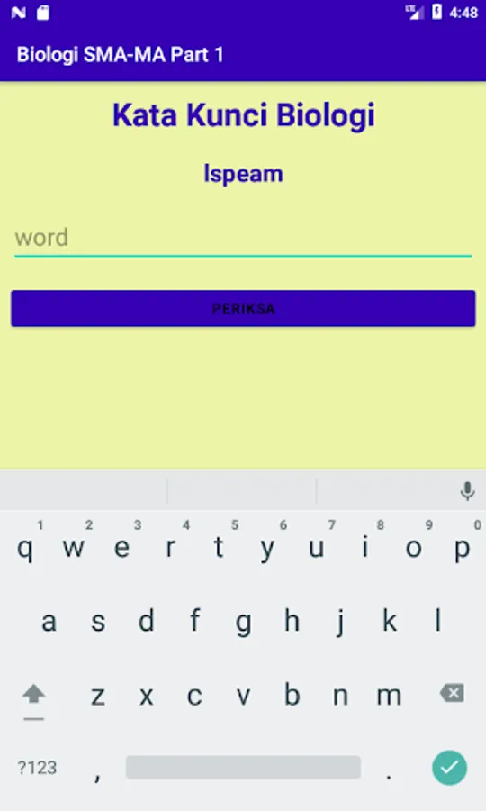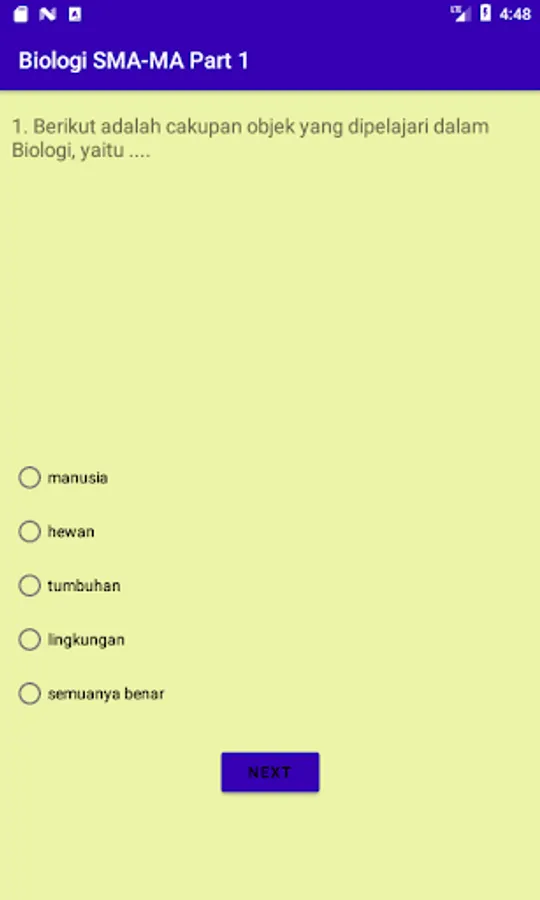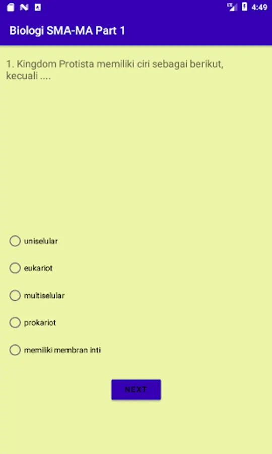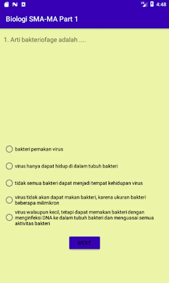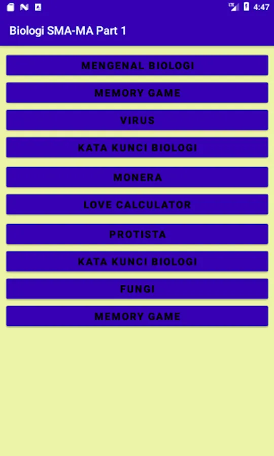 This application contains practice questions for Biology and their scores on Knowing Biology, Viruses, Monera, Protists, and Functions. In addition, it is also equipped with educational games to train focus, concentration, and remember key words in Biology concepts