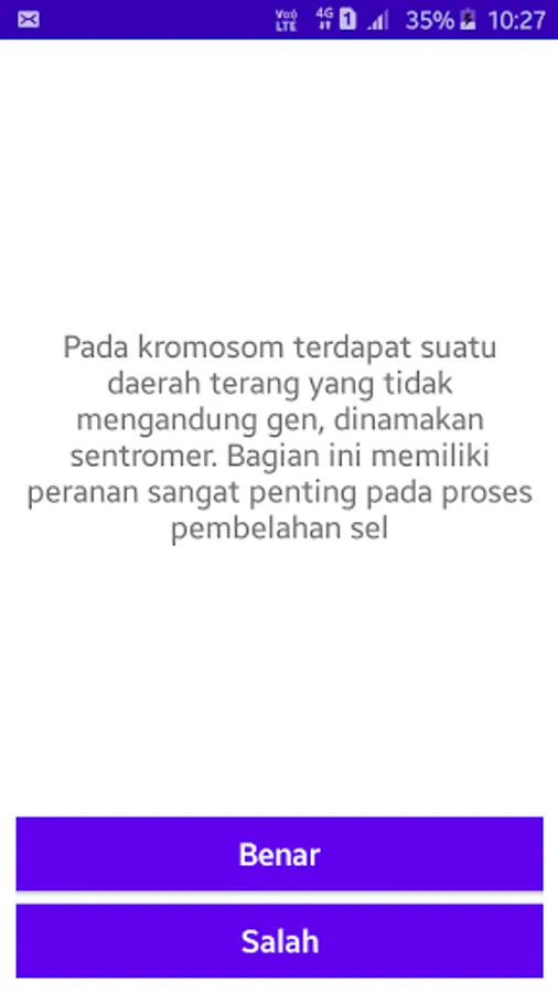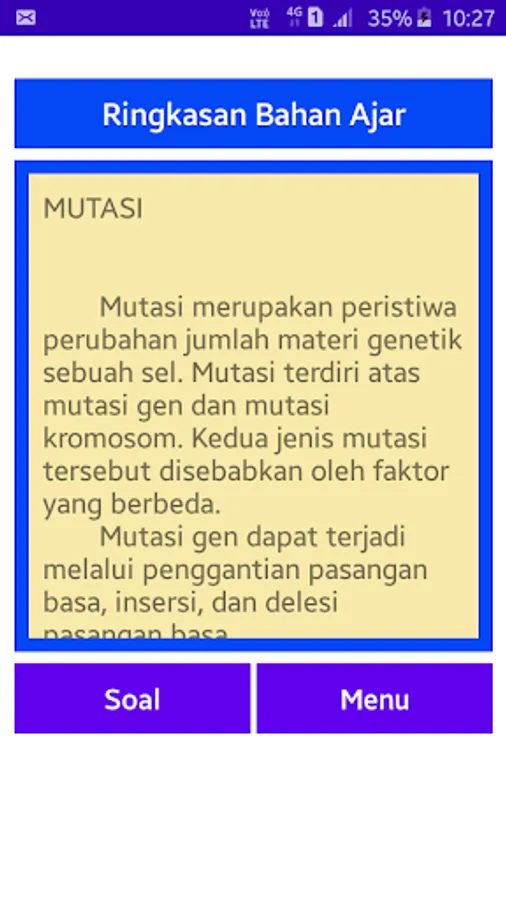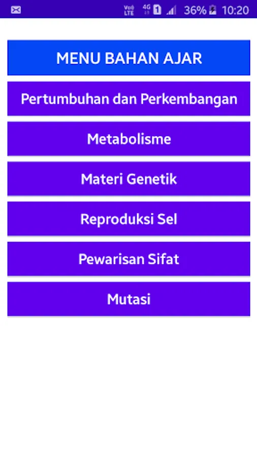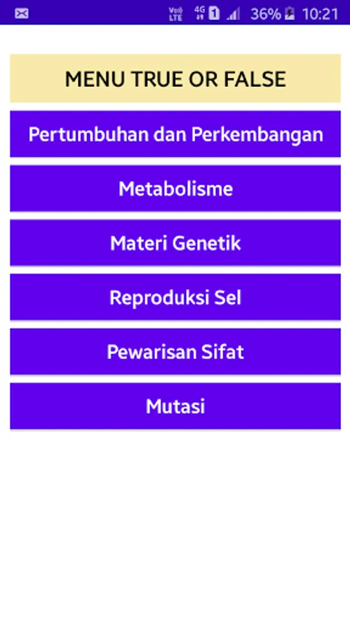 Biology learning application for SMA/MA discusses Growth, Development, Metabolism, Genetic Material, Cell Reproduction, Inheritance of Traits, and Mutations. In addition to scoring, it is also equipped with a Summary of Teaching Materials, True or False, and Educational Games to Train Focus, Biology Keywords, Throw Bottles, and Train Concentration.
