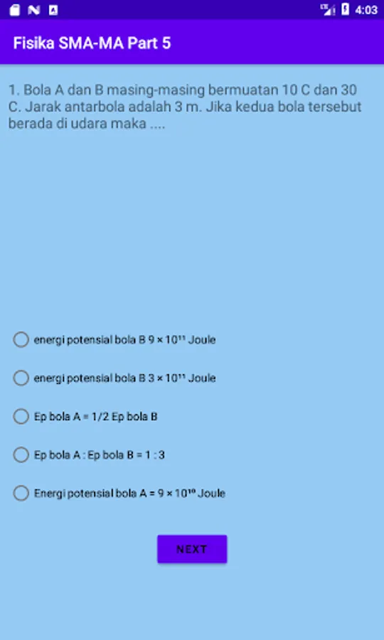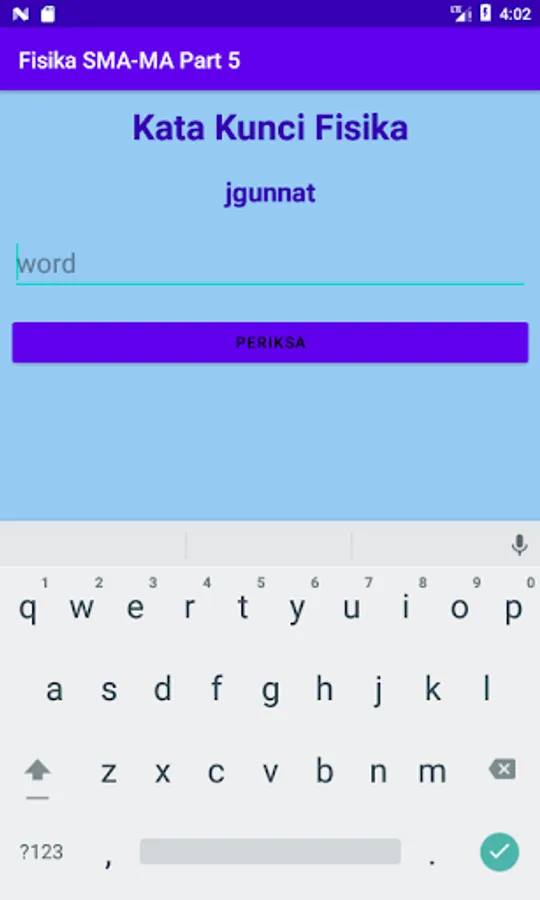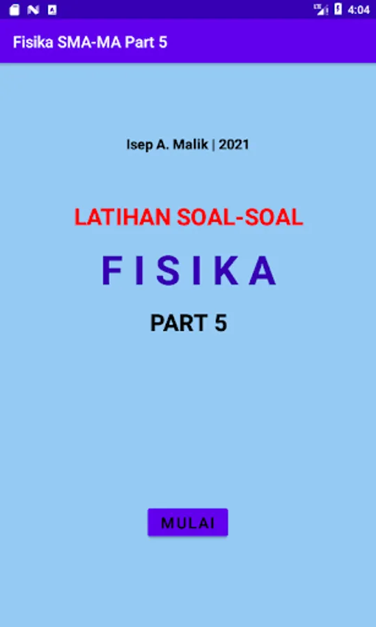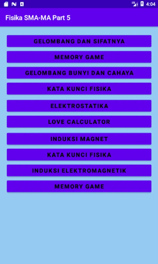 The application discusses Waves, Wave Properties, Sound Waves, Light Waves, Electrostatics, Magnetic Induction, Electromagnetic Induction, and Alternating Electric Current. The application is also equipped with educational games Focus Training, Physics Keyword, Bottle Throw, and Concentration Training.