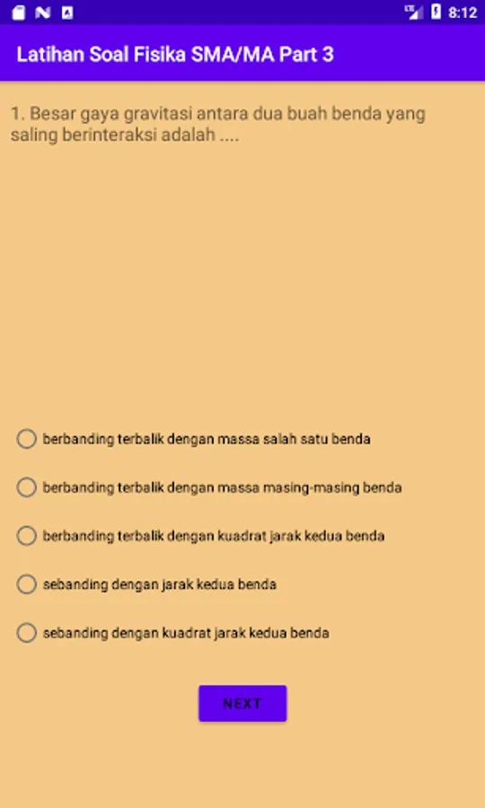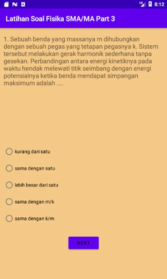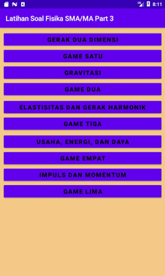 The SMA-MA Physics learning application discusses Two-Dimensional Motion, Gravity, Elasticity and Harmonic Motion, Work, Energy, and Power, Momentum and Impulse. Besides being accompanied by scoring, it is also equipped with educational games to practice focus, concentration, and keywords in physics.