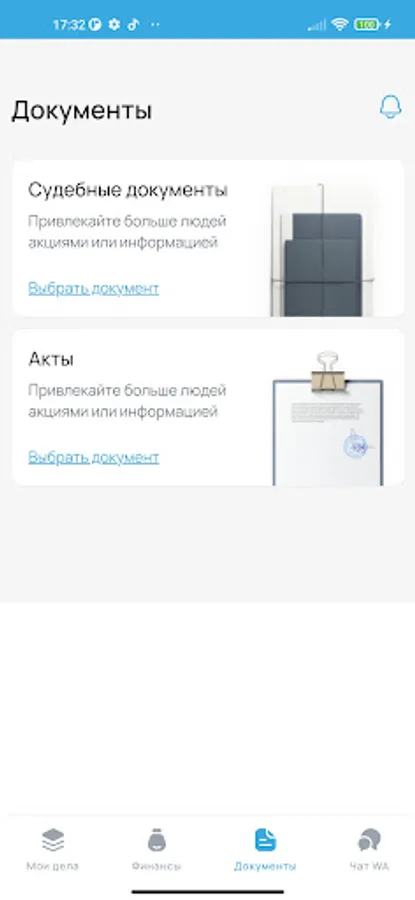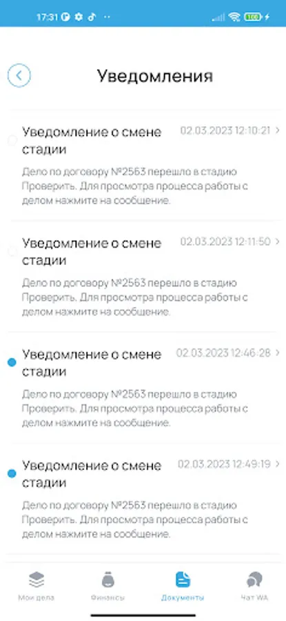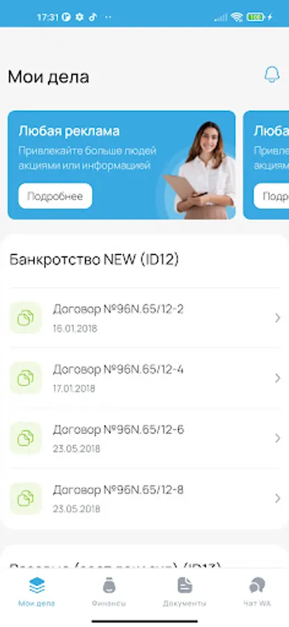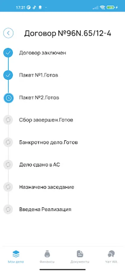 Using the mobile application, you can follow all bankruptcy cases, as well as their individual stages. You will always be aware of court hearings related to the bankruptcy procedure. You do not have to collect documents from court websites, because they will all be accumulated in the mobile application, you can review them at any time. It is also convenient to track payments for each stage: prepare for payment of upcoming stages of work and see the debt. In the mobile application, it is possible to contact the company's expert on all issues via Whatsapp.
