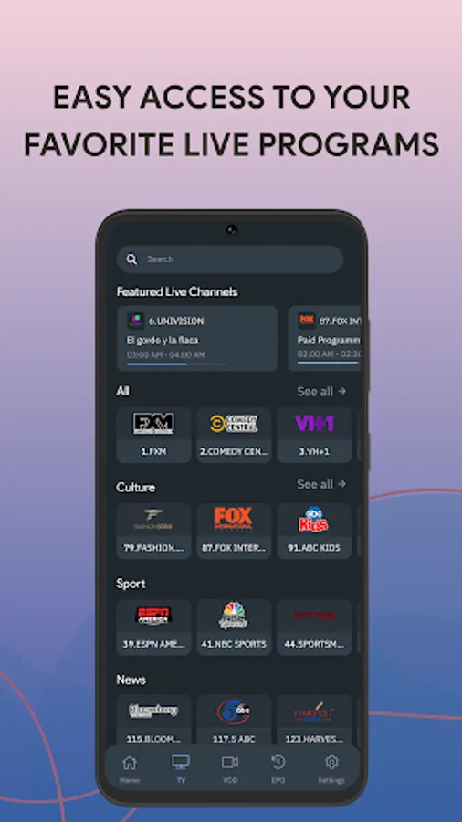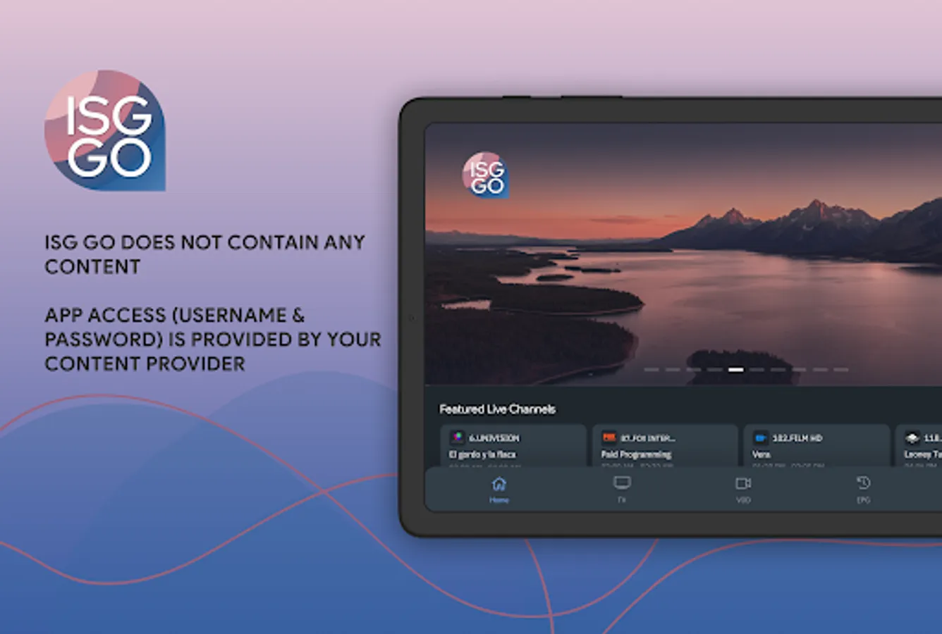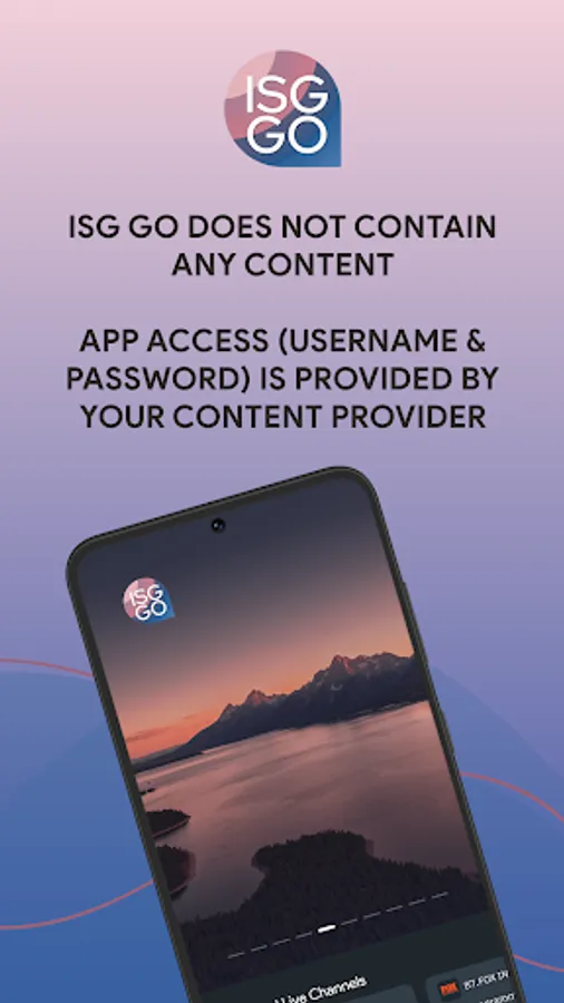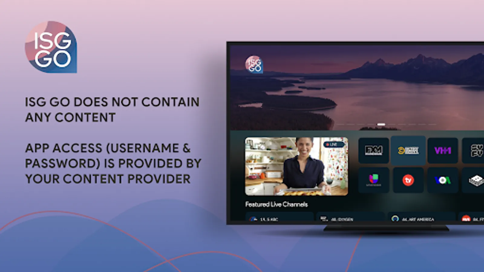 The ISG GO app is an application that requires access from your service provider to view their content. The ISG GO app DOES NOT have any content such as live channels, movies or radios. ISG is the software development entity that has developed the ISG GO app, which is built to be a media player for providers to offer their content to their end users.