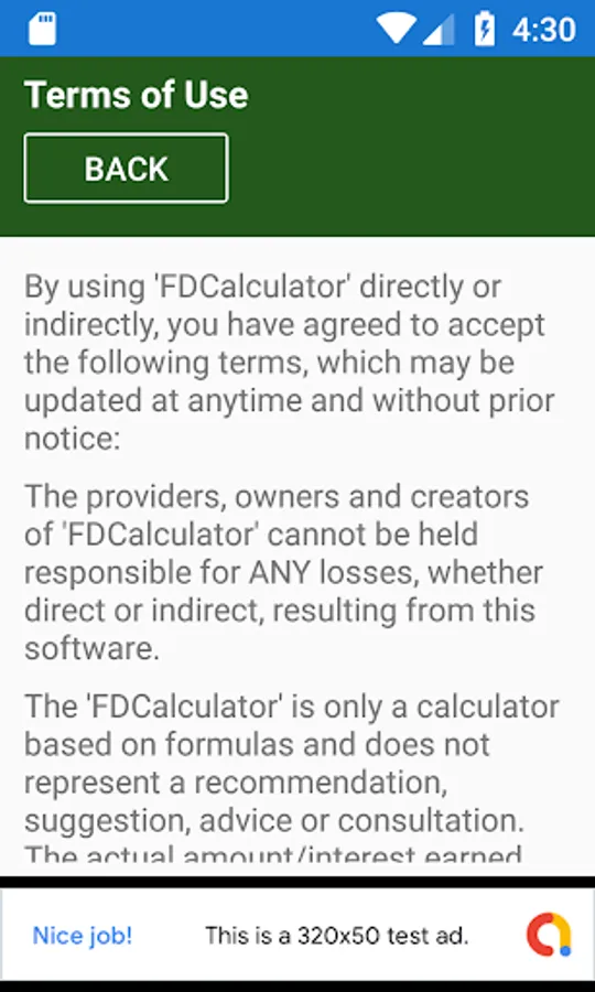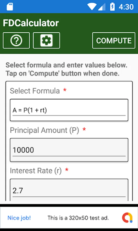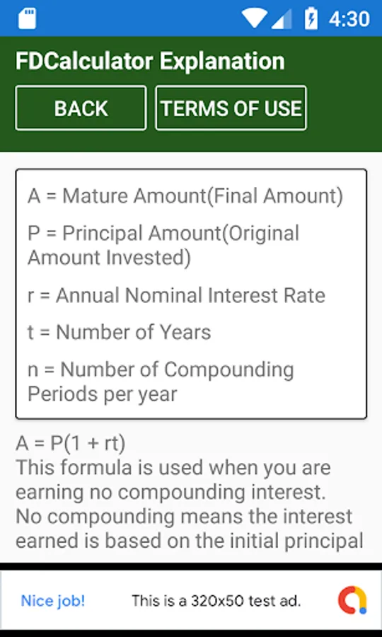 FDCalculator is an application that calculates your fixed deposit investment based on formula provided. For each formula there is a short explanation on how your interest is earned.