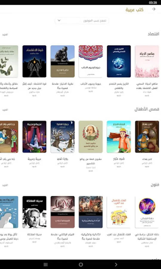 > المواضيع: سياسة، أدب، شعر، فلسفة، قصص بوليسية، قصص للأطفال، علوم، تاريخ، دين، دوريات ومجلات، إدارة أعمال...