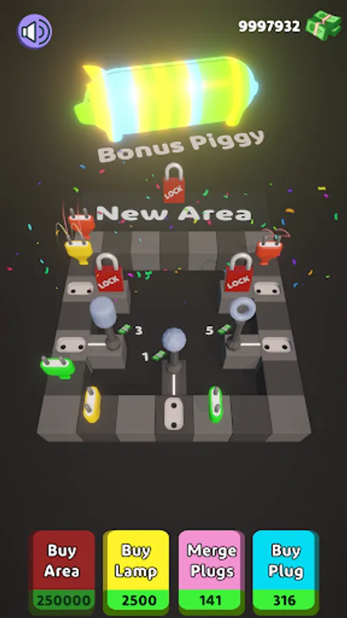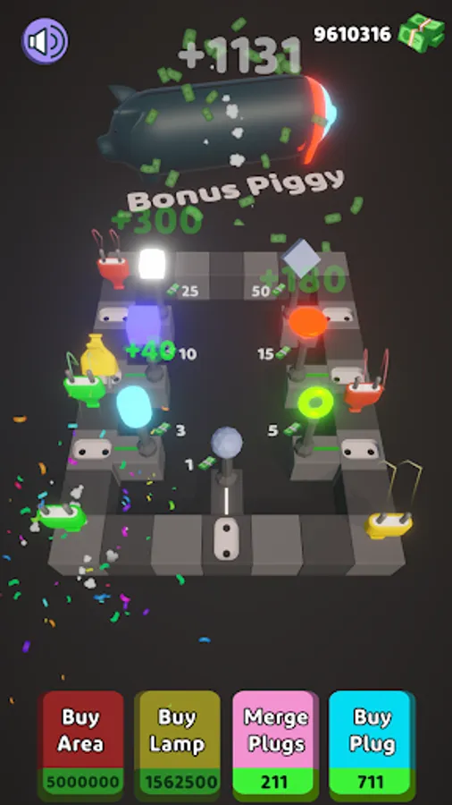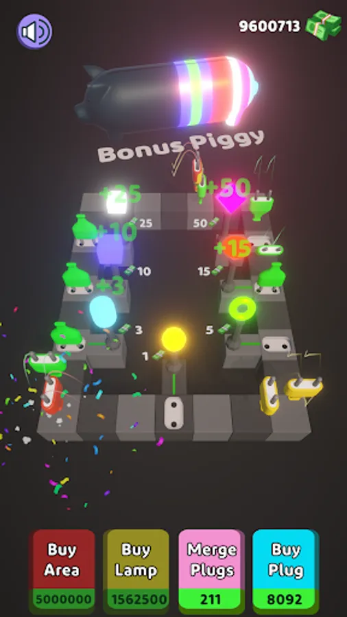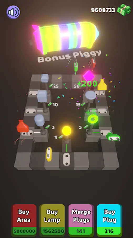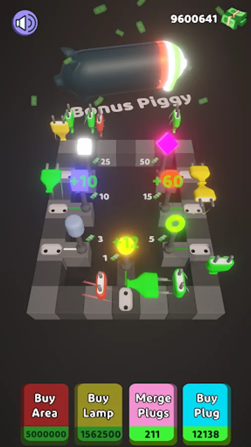 Speed up plugs, turn on lights and earn money. Buy more plugs, more lamps with the money you earn. merge and strengthen your chips. Don't forget to fast-load the bonus pig.