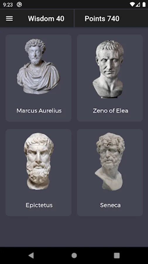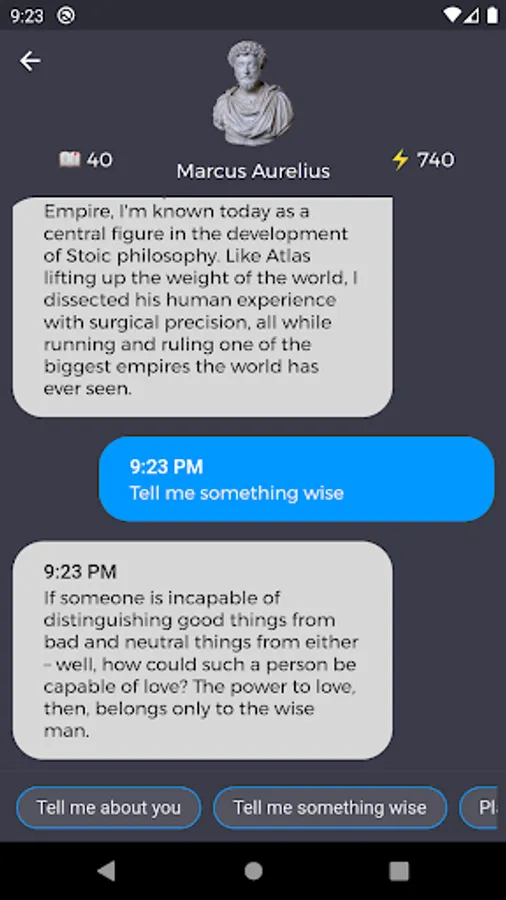 This app enables you to chat with phylosophers from ancient times (Marcus Aurelius, Zeno of Elea, Epictetus, and Seneca)