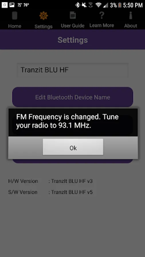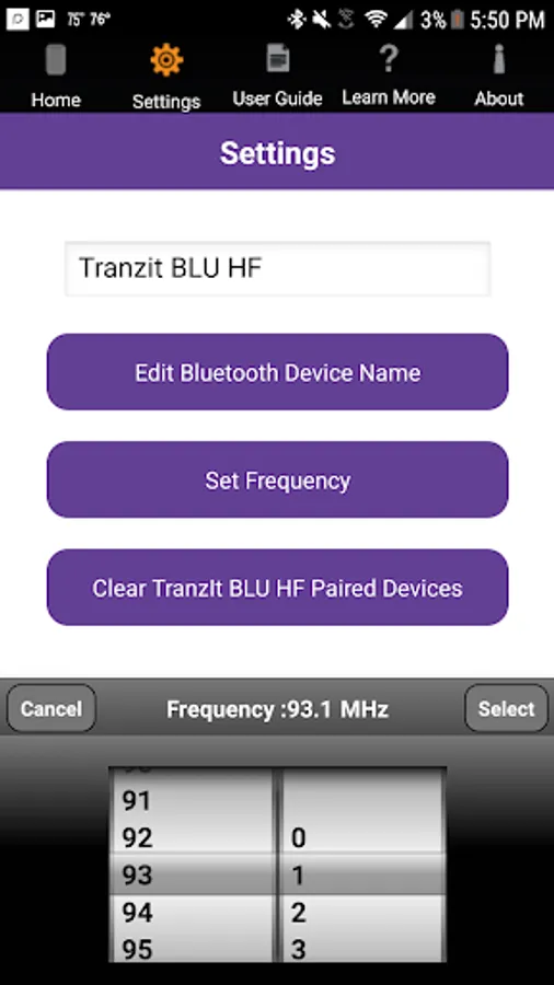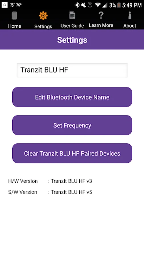The TranzIt BLU HF App also allows operators to change the device name and clear any previously paired Bluetooth devices.