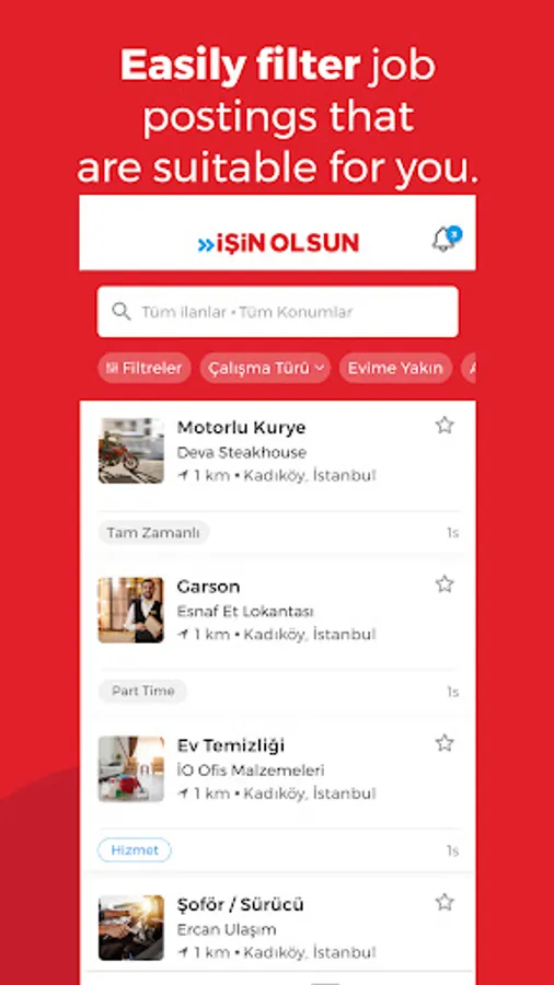 İşin Olsun instantly offers the newest job advertisements for various positions like waiter, secretary, cleaning staff, chef, security guard, courier, motorcycle courier, store staff, cargo personnel, driver, cashier, salesperson, technician, in restaurants, offices, business centers, restaurants, shopping malls, stores, markets, industrial centers, factories, and many other places.