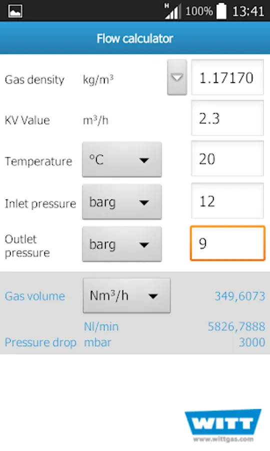 And to choose always the suitable euipment for your gas application iGASES includes a gas flow calculator. Just choose your gas, fill in Kv value of the valve, temperature and pressures and you will get the gas volume flow and the pressure drop.