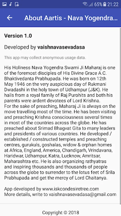 This app contains top 15 aartis composed by pure vaishnava saints and sung by Nava Yogendra Swamiji Maharaj.