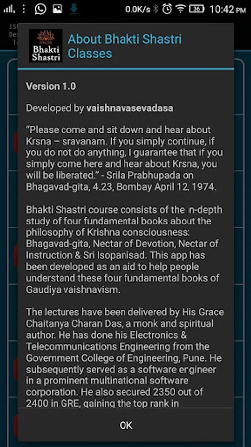 Bhakti Shastri course consists of the in-depth study of four fundamental books about the philosophy of Krishna consciousness: Bhagavad-gita, Nectar of Devotion, Nectar of Instruction & Sri Isopanisad. This app has been developed as an aid to help people understand these four fundamental books of Gaudiya vaishnavism.