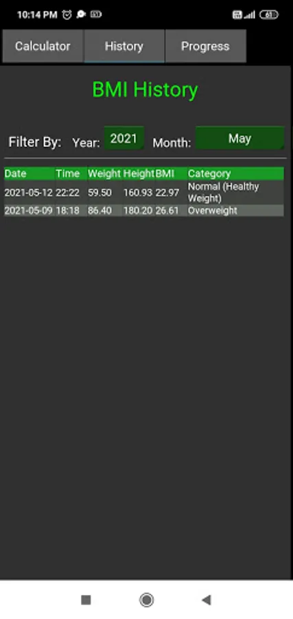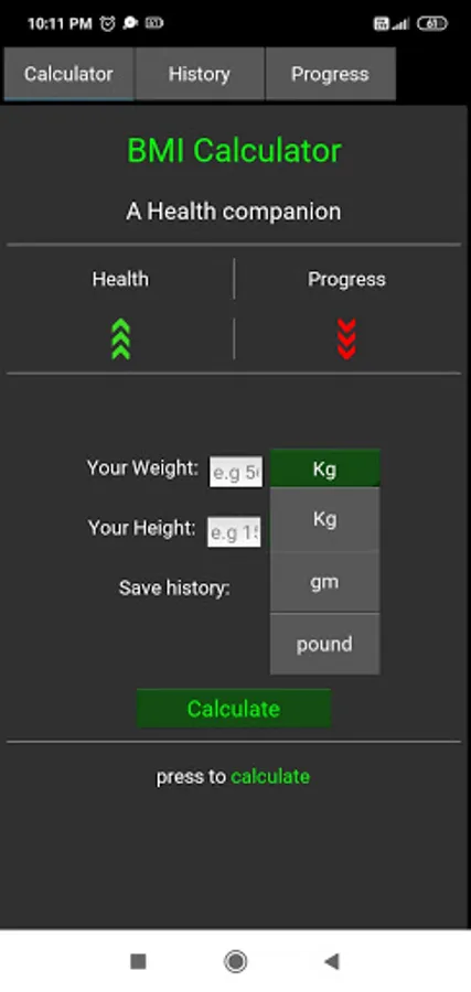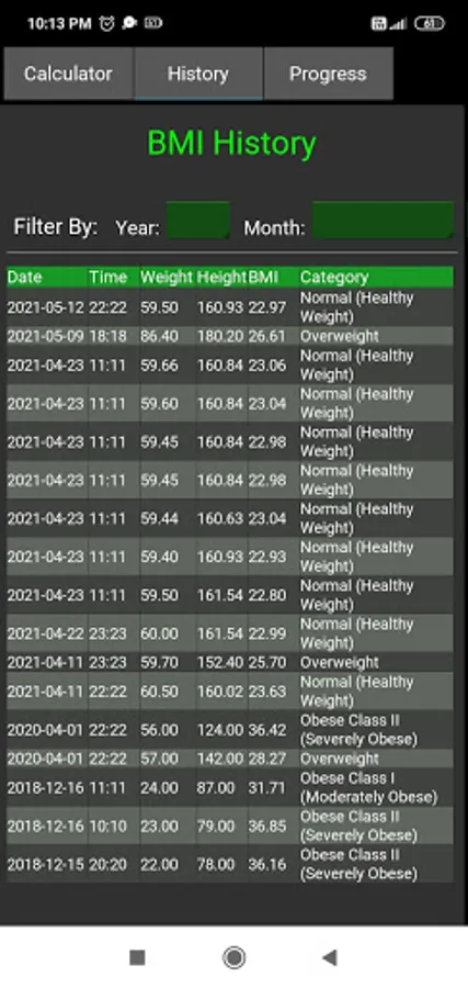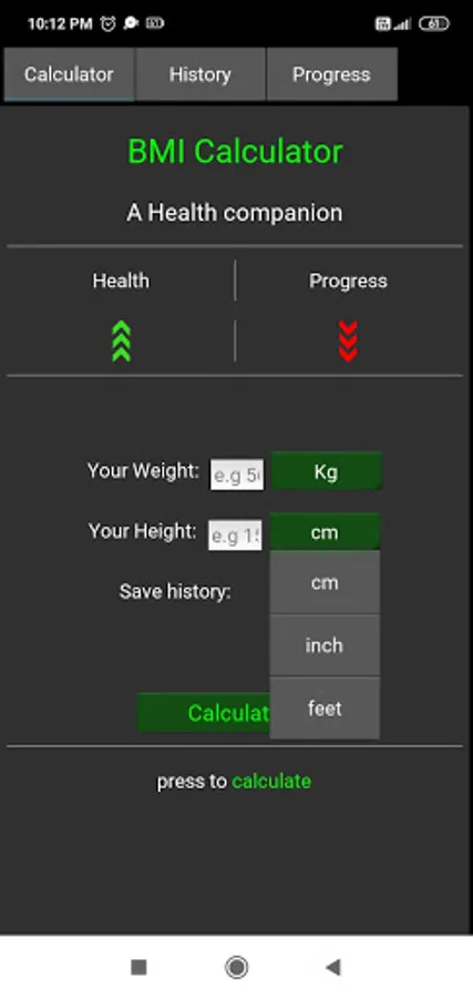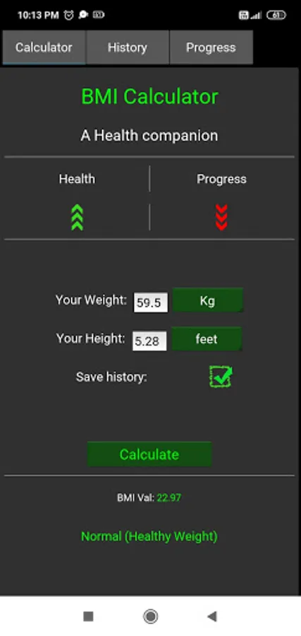 This BMI calculator app with help you keep saving your body BMI index history, to track the progress made in past / last days.