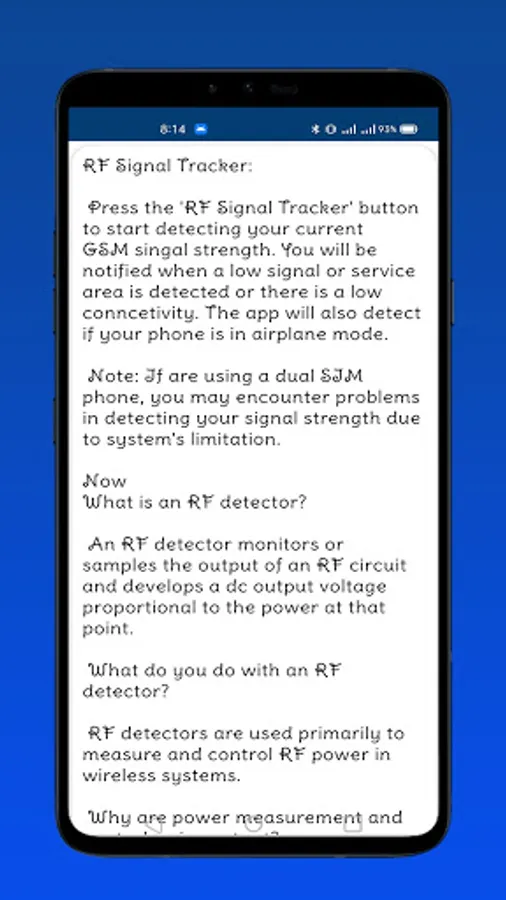 An RF detector monitors or samples the output of an RF circuit and develops a dc output voltage proportional to the power at that point. RF detectors are used primarily to measure and control RF power in wireless systems. RF Signal Tracker You can monitor the RF and WiFi signal strength as seen by the device as well as WiFi hotspots, describe a cell site's zone of coverage, identify changes in technology and handover points, and save and playback that data. SSA Outdoor RF Signal Tracker and Site locations can be loaded into a database via a CSV file or by long-pressing the map on a location to manually insert the site to the database.this app is design for RF engineers to measure and log signal quality directly on their Android smartphones. SSA Indoor RF Signal Logger are used to track signal.