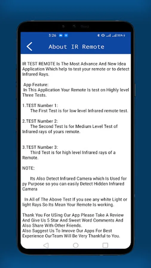 Are you confuse about whether the problem is in remote or tv, or other absorbing devices, You can now test your Remote control by using your cell phone and our IR Remote Tester app. You can also use it as Hidden IR Camera Detector. Do you know you replace cells in your Tv remote or Other remotes. and its still not working?
