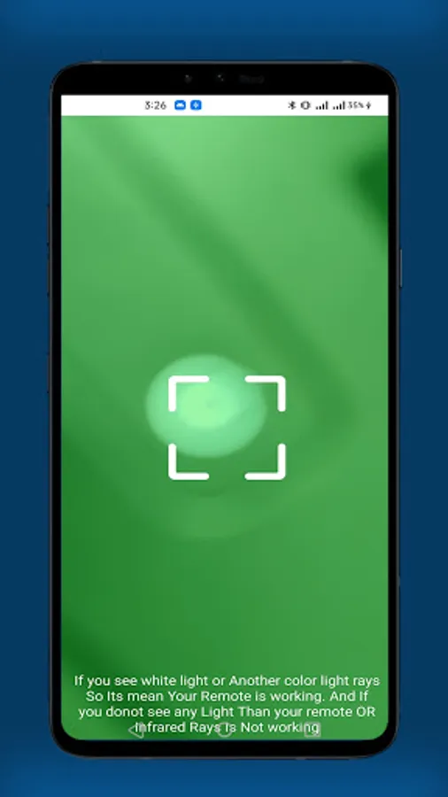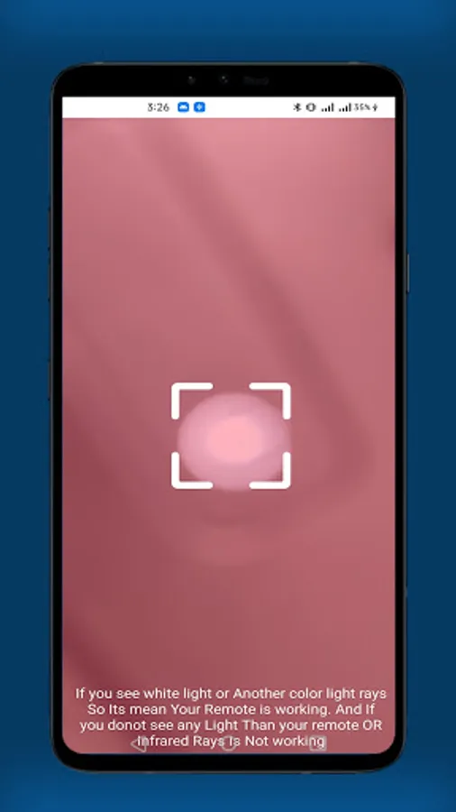 Turn on the Remote Tester app After open of the IR Remote Tester app for android. Point the end of the remote control with the Infrared transmitter Press & hold one of the Button on the remote to Test. If the remote controls is sending a signal ofIR Infarred ray, you should see a Light or white light in the of view finder cell phone or mobile screen when you press button on the Car Remote, light remote, Mp3 remote Ac Remote, laser remote Infrared Remote , Mobile remote, Tv remote, Bulb Remote, Fan Remote, IR Remote App for Android. Our app detected infrared camera which is emitted by tv remotes infra camera, and other remotes Our Universal Remote testers and IR Remote Controllers, feature shows you white bright light, which is not visible with naked eye our special IR Infrared Camera Detection, Founder, Detected, detectors, Filter. which easily Detects Infrared rays e.g infrared remote rays, Infrared camera,.