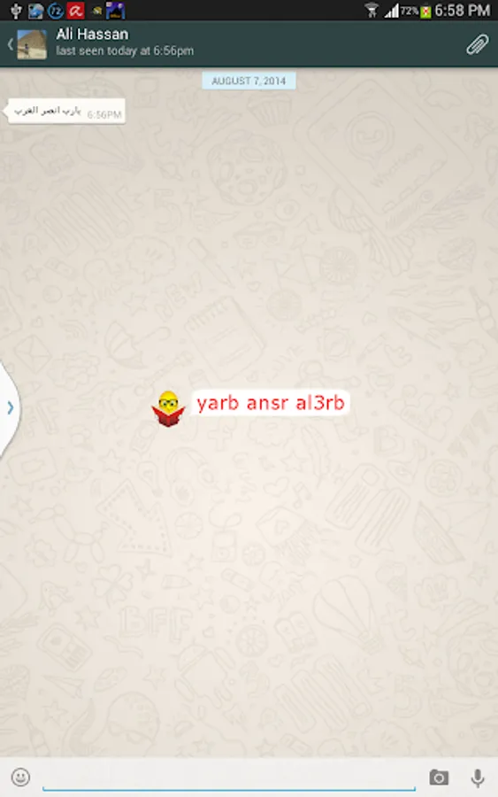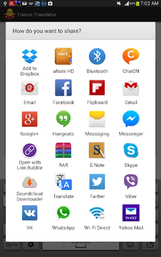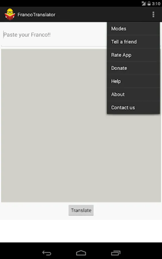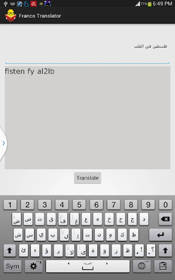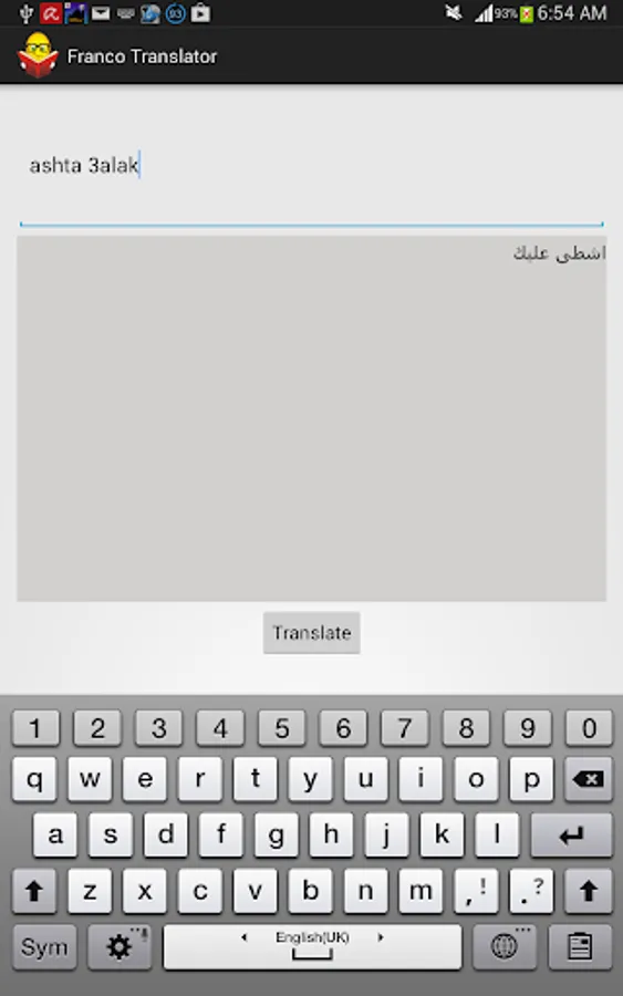 ***In Pro Plus mode (New!!!)*** you can translate text before sending it to your friends easily during chatting So, never mind whether your friends know Franco or not!!! simply cut your text and press paste. Wow! how easy is that.