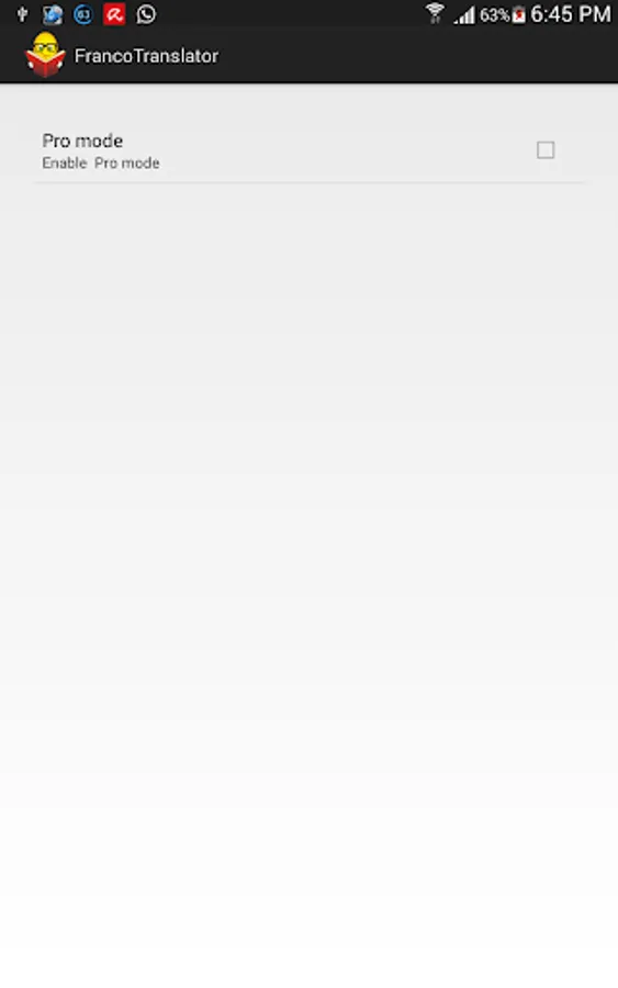 Franco Translator is an amazing application which help you to translate and switch between Franco and Arabic and make you easily understand and learn any Franco abbreviations, words and phrases. You can use Franco Translator in three modes, Default, Pro, and Pro Plus modes.