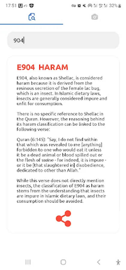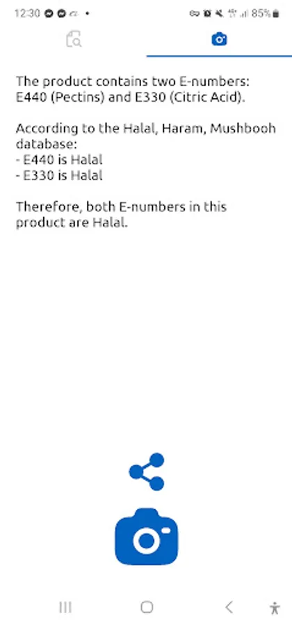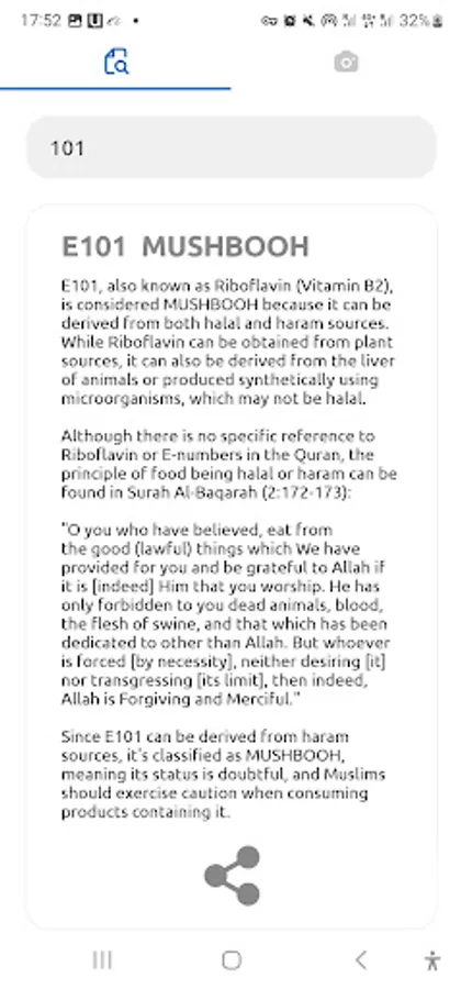 Introducing the AI Camera Enhanced Halal Check - A revolutionary new feature that simplifies the process of identifying Halal food additives. Just snap a picture of e-numbers, and our AI-powered app will take care of the rest, providing you with accurate Halal status and relevant Quran references. The reason why camera permission is needed is because e-numbers will be analyzed from the product ingredients list if it contains e-numbers. Once the analysis is complete, you can simply go back to the Halal, Haram, and Mushbooh list to read more details about each e-number found in the analysis.