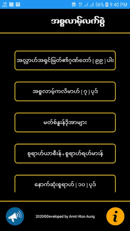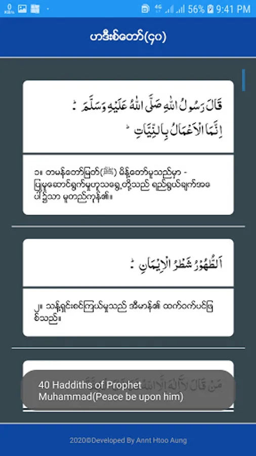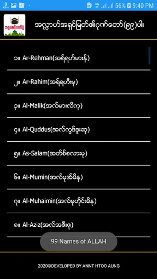 This application is intended to enhance Islamic knowledge. It 's easy to read. Note. : Ravi pronunciation is not written in Myanmar, except in honorifics. Created by: Annt Htoo Aung