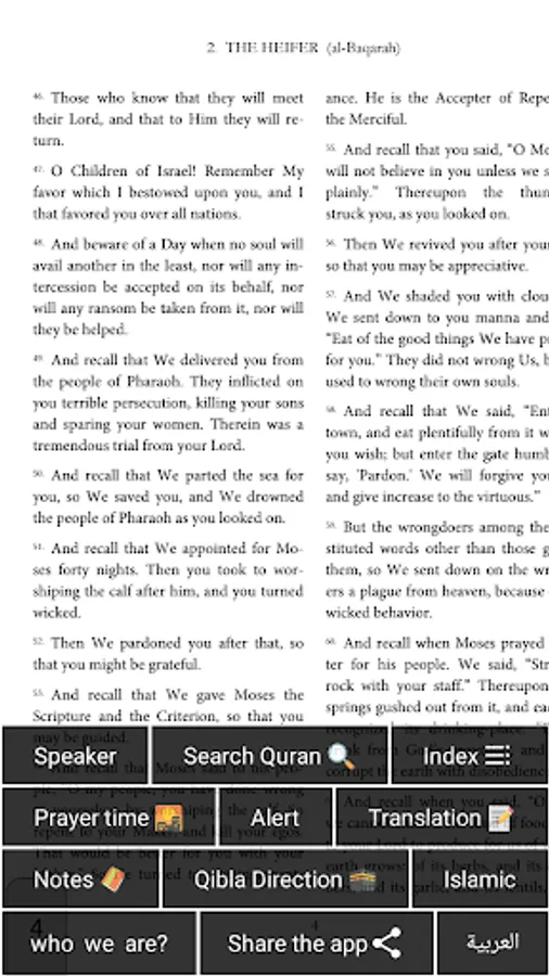 Audio recitation in high quality with the voice of the most famous readers (Abdulbaset Abdul Samad, Mohammed Siddiq Minshawi, Abdulrahman Al-Sudais, Ahmed Al-Ajmi, Abdulrahman Al-Hudhaifi, Nasser Al-Qatami, Saud Al-Shuraim).