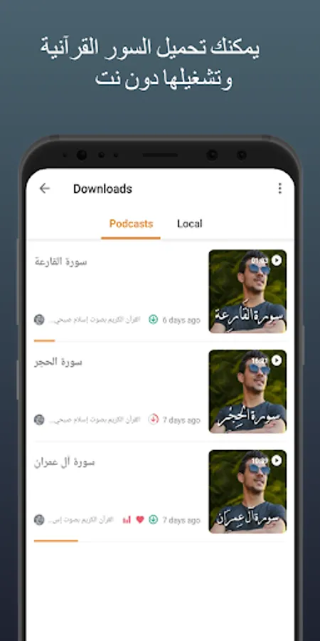 - Downloads section: which displays all the downloaded Holy Quran Audios with the ability to play them when there is no internet.