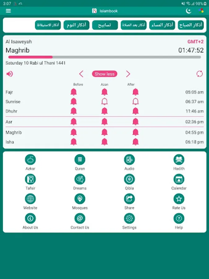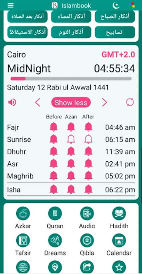 Prayer Times, Quran, Azkar, Hadith, Tafsir, Dreams, Audio, and Mosques Finder.