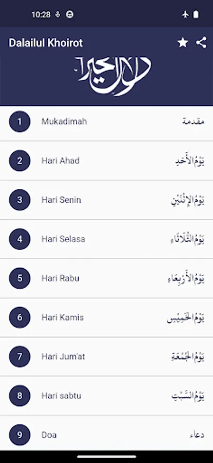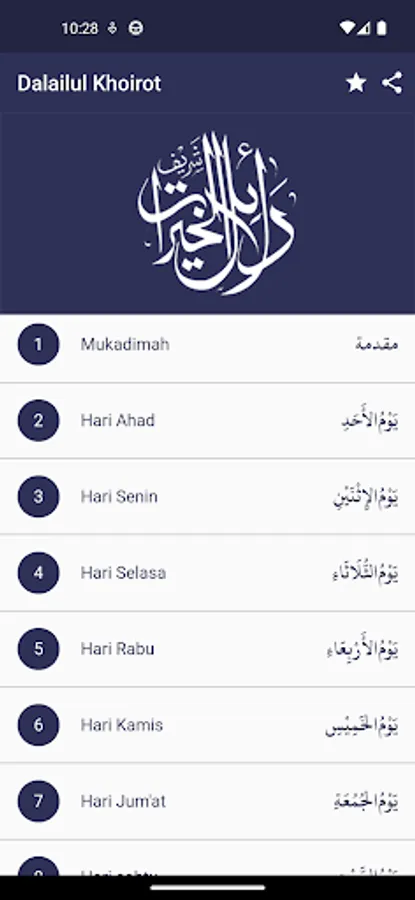 The application of the Dalailul Khoirot Book (دلائل الخيرات) Complete, from monday to Sunday dhikr. This Dalail Khairat book is the work of Sheikh Muhammad Al Jazuli or Abu Abdullah Muhammad bin Sulaiman bin Abu Bakr al-Jazuli al-Simlali. Inside there are strings of prayers, dhikr and various prayers.