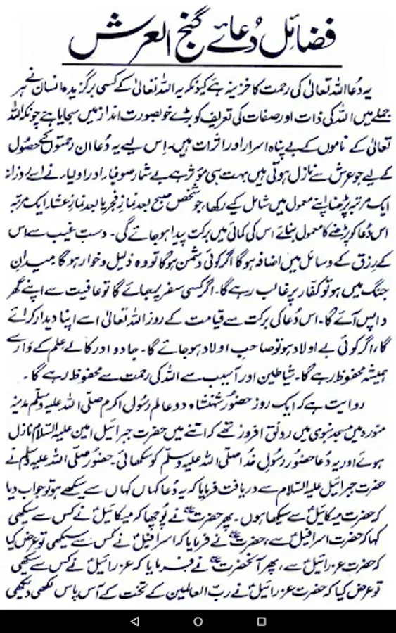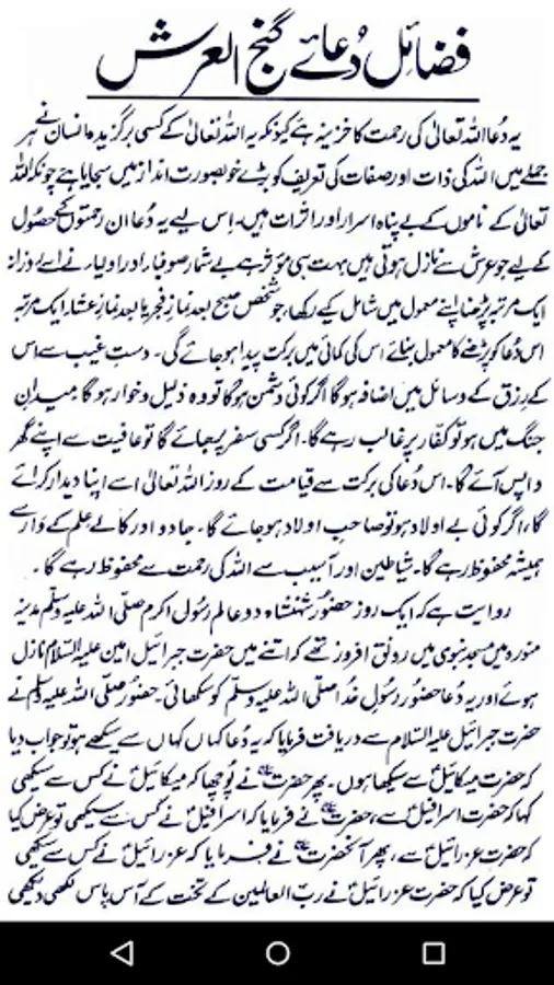 One day Sayyidina Rasuli Akram (PBUH) was sitting in the Masjid Nabvi and Hazrat Jibreel Alaihi Salaam brought this Dua' to Rasulullah Sall Allahu alaihi wa Aalihi wa Sallim. He said that in addition to a lot of Fadhaail [favors] in this Dua', the reciter of Dua Ganjul Arsh gets three things from Allahu ta 'ala. Firstly, Allah Subhaana Hoo gives him rizq [livelihood] from the ghayb [unknown sources], and thirdly, whoever recites Dua Ganjul Arsh his enemies will not be able to overcome him. He will be superior to them.