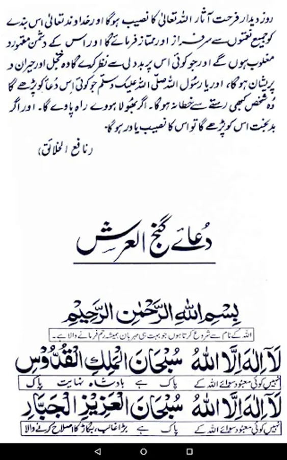 He will be safe from all the bad things and insects and other things on earth and all the bad things in the skies. If a person writes Dua Ganjul Arsh out and drinks it using rain water, he will get help for various diseases. If a person suffers from an unknown illness for which the worldly doctors can find no cure and he writes it [with permission of a True Shaykh, with Zafran [saffron] and washes it and drinks it for twenty one [21] days he will get health from that Bi Ithnillah. If he doesn't have children, he will get children with the help of this Dua'.