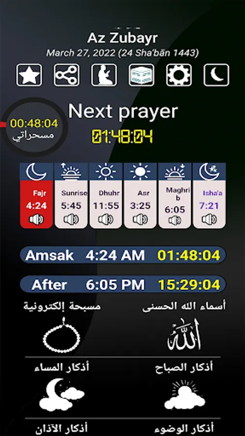 الآذان ومواقيت الصلاة بكامل الدقة على حسب موقعك الحالي فيطلب من المستخدم الوصول الي موقعك في بداية التطبيق
