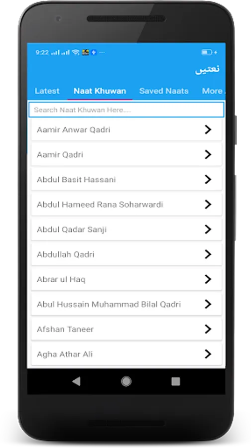 Application have following naat khuwan. Khurshid Ahmad , Awais Raza Qadri, Waheed Zafar Qasmi, Siddiq Ismail, Javeria Saleem , Prof. Abdul Rauf Roofi , Yousuf Memon , Sami Yusuf, Maulana Tariq Jameel.