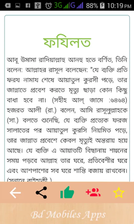Ayatul kursi – is another feature of our app . Ayatul kursi is very important dua of quran for every muslim . How ever every muslim Should be Continue dua and quran telawath if who want increase rizik , wealth and protect from shoytan. Prophet Hazrat Muhammad SM (PUBH) narrated the importance of Ayatul kursi in various segments/ situation of his life. And also Hadith; its narrated that, Ayatul Kursi can save your life in different situation. Our app consist ayatul kursi mp3 / ayatul kursi audio and ayatul kursi bangle translation .