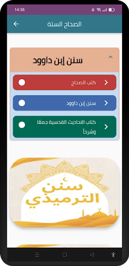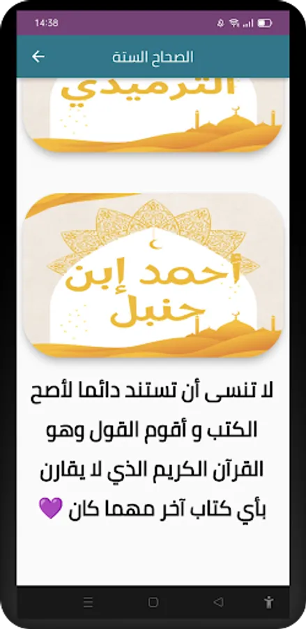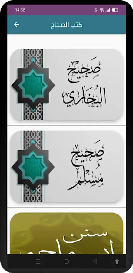 The Six Sahihs, the collection of hadiths of the Prophet, with al-Sharawi’s explanation of the sacred hadiths, Sahih Muslim, Sahih al-Bukhari, Muwatta Malik, Sunan al-Darmi, Sunan Ibn Majah, and Sunan al-Nisa’i.