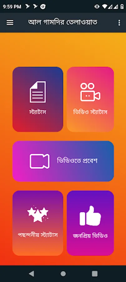 In this category there are videos with Bangla meaning of 1 to 30 para recitation of Qur'anul Kareem in the voice of the world's best Qari Al Ghamdi. The app provides audio recitations of the Quran by different Qari (reciters) in different styles and pronunciations.