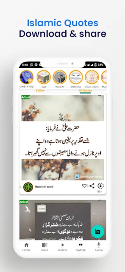 In the app, everyone is allowed to upload Islamic Quotes. user download and share Islamic quotes with a single click with others. there are some kinds of Islamic quotes described: