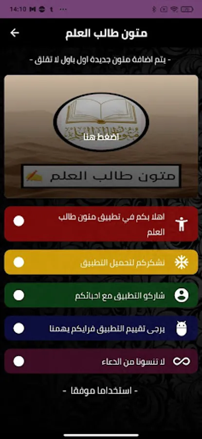 The text of the seeker of knowledge is suitable for young and old, for all ages, it offers the most important and best texts of the seeker of knowledge, stories and lessons that you can learn just by downloading the application of the text of the seeker of knowledge