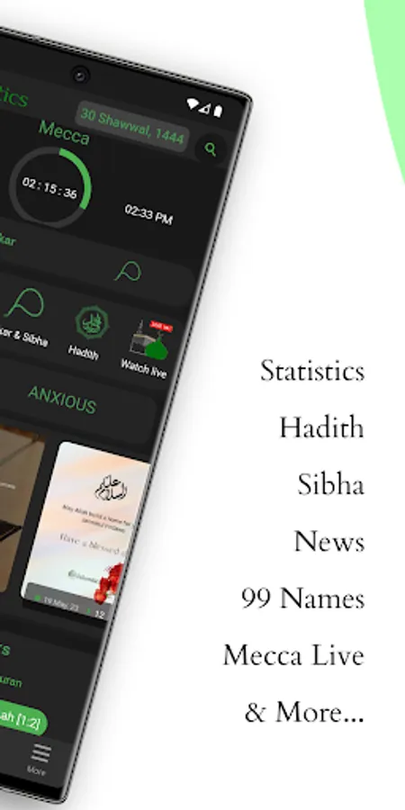 -Use the digital Sibha feature to keep count while reciting Dhikr.