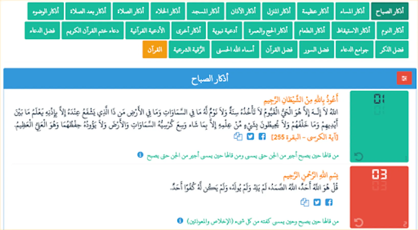 اذكار الصباح، أذكارالمساء، تسابيح، اذكار الصلاة، اذكار بعد الصلاة، جوامع الدعاء، أدعية نبوية، الأدعية القرآنية، أدعية الأنبياء، أذكار متفرقة، اذكار الآذان، اذكار المسجد، اذكار الوضوء، اذكار المنزل، اذكار الخلاء، اذكار النوم، اذكار الاستيقاظ، اذكار الطعام، أذكار الحج والعمرة، دعاء ختم القرآن الكريم ،فضل الدعاء، فضل الذكر، فضل السور، فضل القرآن، أسماء الله الحسنى، الرُّقية الشرعية، والقرآن.