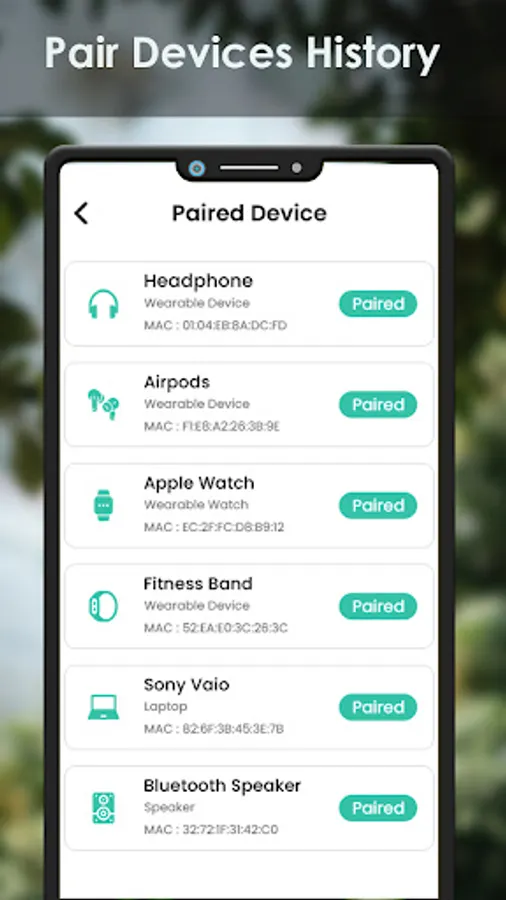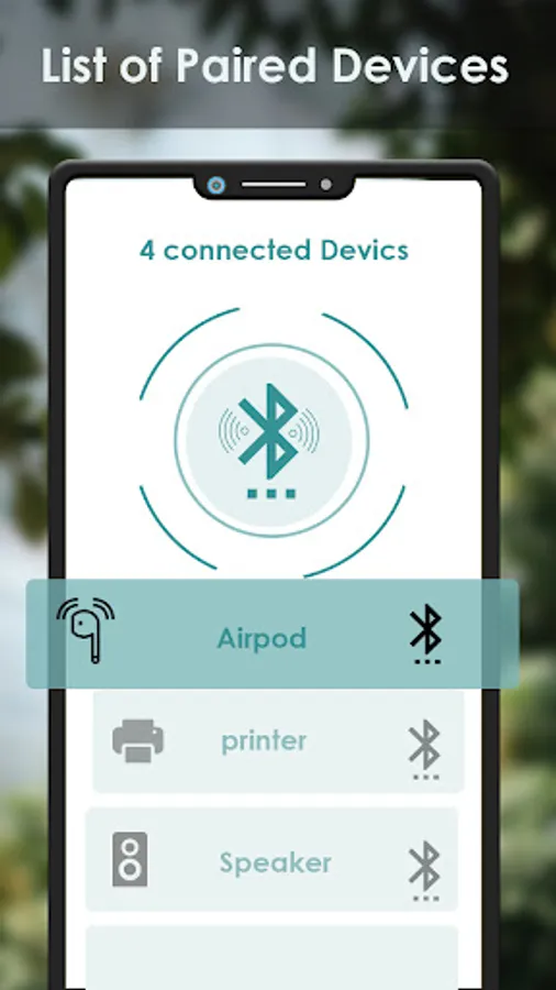 Find all Bluetooth devices by state like connected, paired, and unknown devices like wireless headphones, earbuds, Bluetooth speakers, mobile phones, etc that is in your phone range.