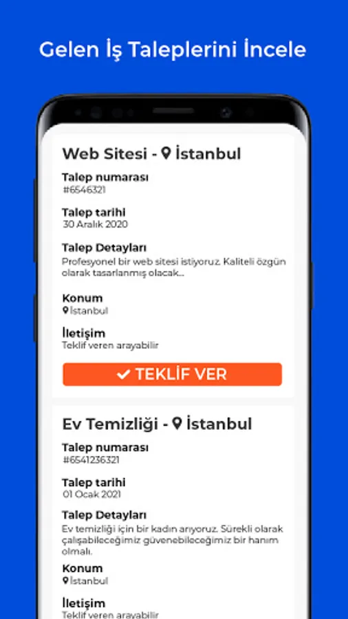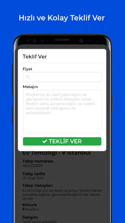 Service requests are received from all provinces of Turkey. Evaluate the incoming requests and examine the details of the requests and submit your proposal. When you submit an offer, the customer's phone number and other information you can reach will appear. In this way, contact the customer immediately and discuss the details on the phone.