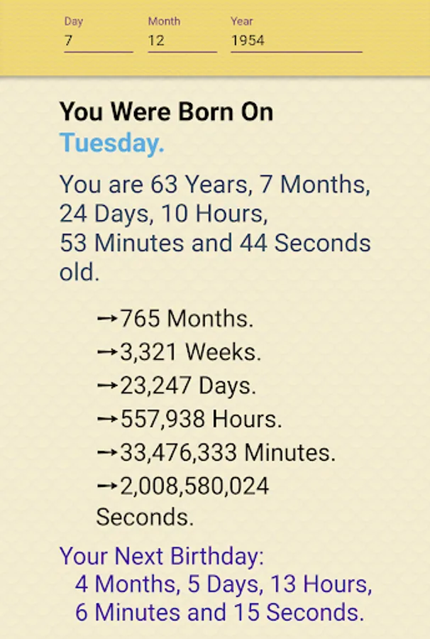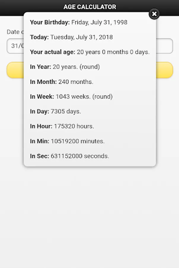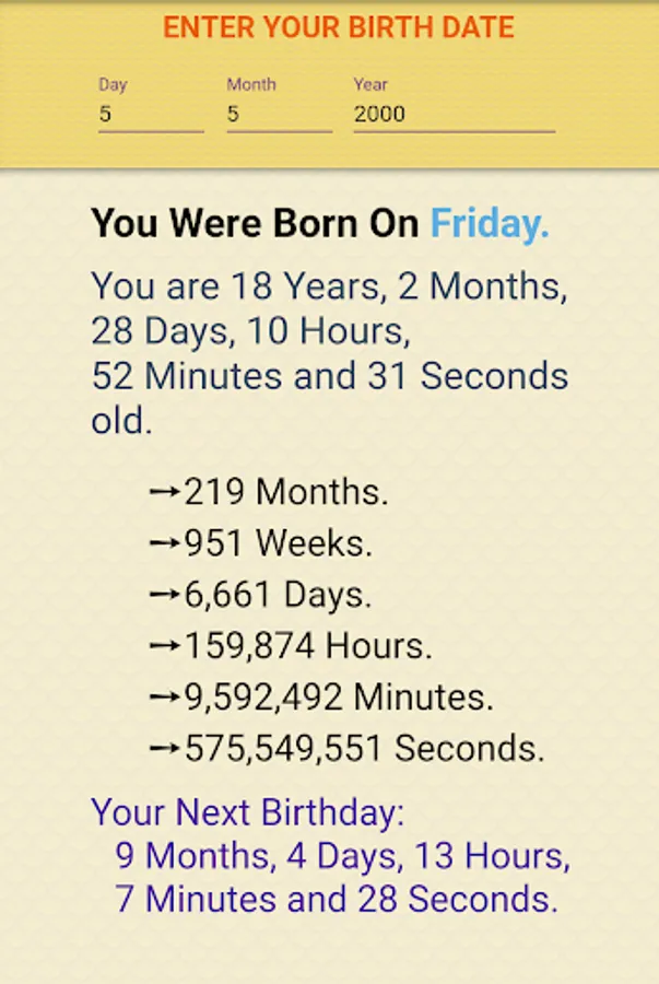 Not only your age it is also shows the clear details of months, weeks, hours, minutes, seconds and even your next birthday details.