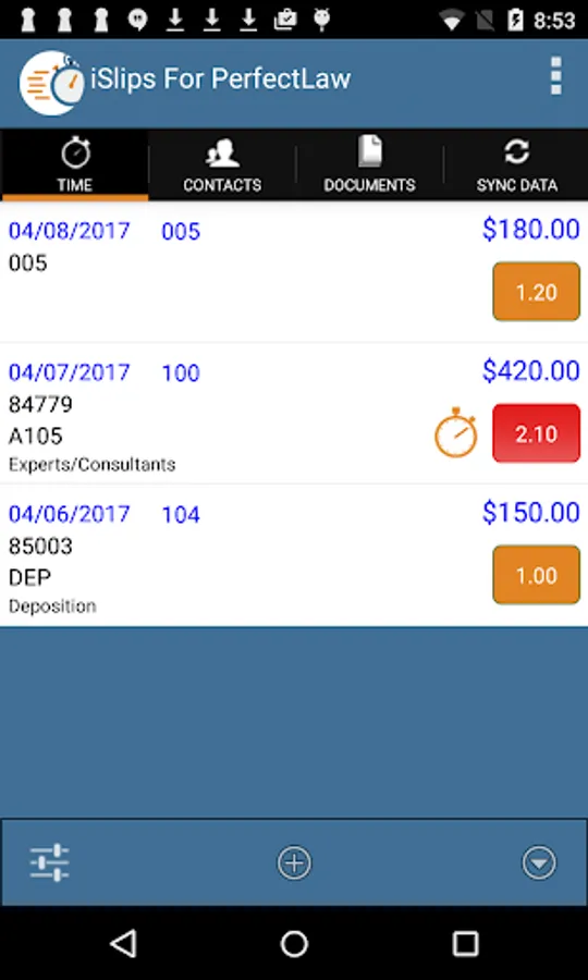 iSlips For PerfectLaw is the fastest solution for tracking time because it takes advantage of the Android phone’s and tablet's “always on” capability. No need to startup a slow computer to track that 15 minute call with a client.