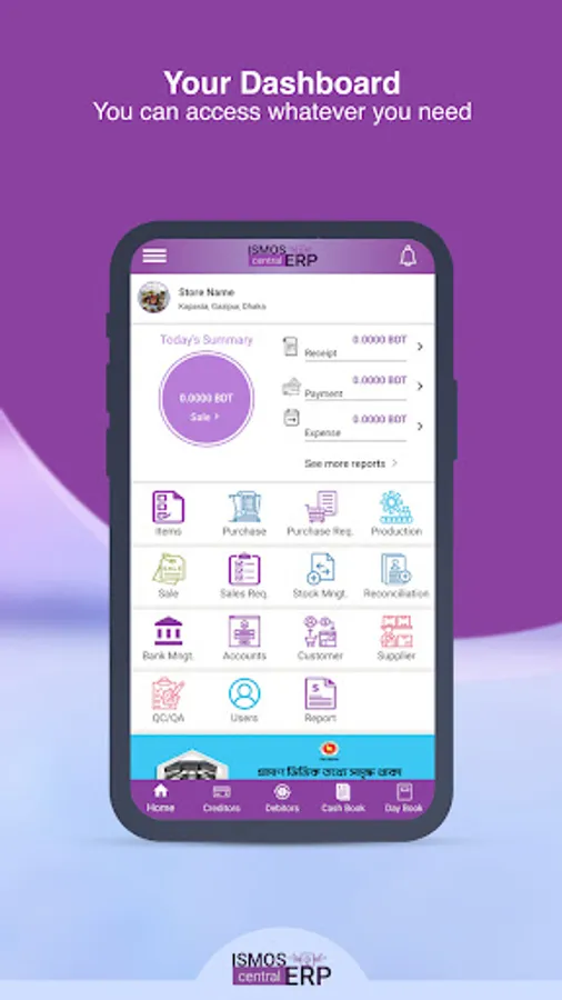 -Create Store, Multi Item Entry, Multi Brand Entry, Add Supplier, Purchase Raw Salt, Purchase Iodine, Production, Add Customer & Sale Finished Salt (Raw, Industrial & Iodized) features