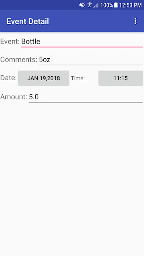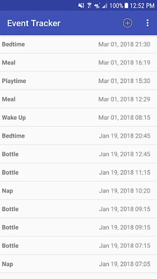 This is an event tracking application, which allows the user to create a daily list of events. Events can include a decimal amount, a date and time, and an extra comment. Events from a specific day or from a range of days can be displayed. The app can calculate the totals of the amounts for each type of event and the average of these amounts for the events currently being displayed.